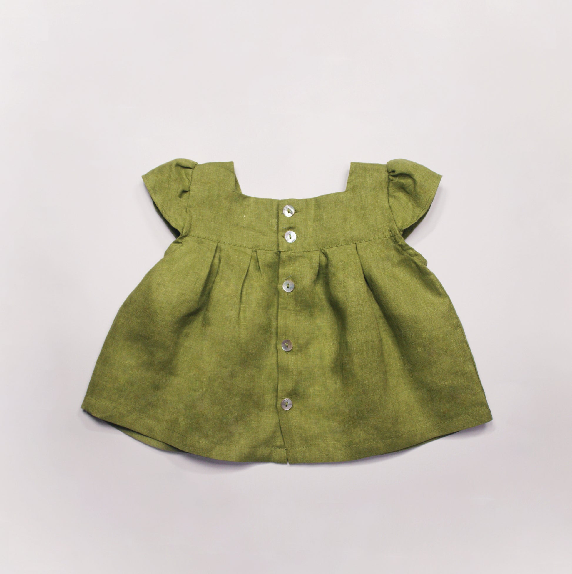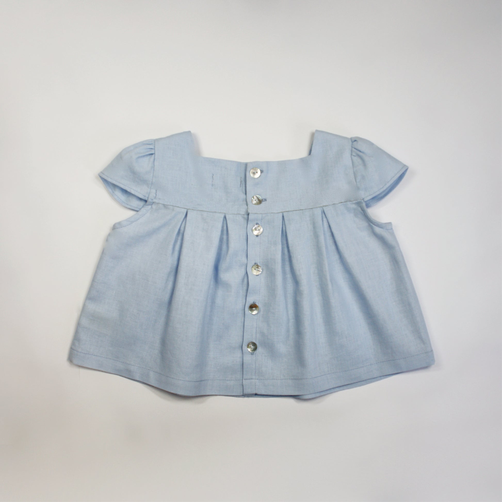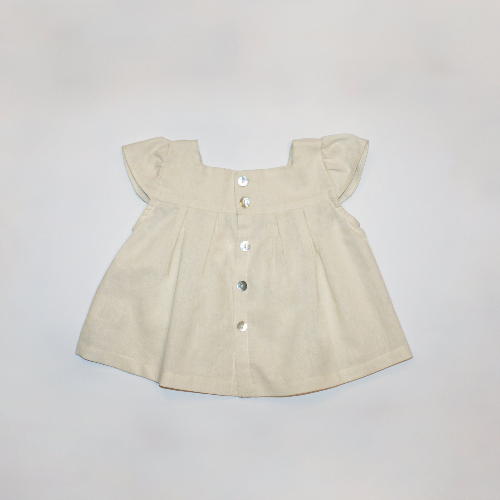 - Mother-of-pearl buttons at the back